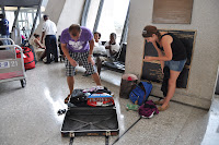 Am Flughafen wog Stephanie vorsichtshalber noch mal ihren Koffer, der natürlich zu schwer war! Also umpacken! Jeanshosen raus und in den Rucksack- neuer Versuch- 19,4 kg! Passt! Es war lustig, das Geschehen um die Waage zu beobachten. Wir waren nämlich lang nicht die einzigsten, die umpackten!