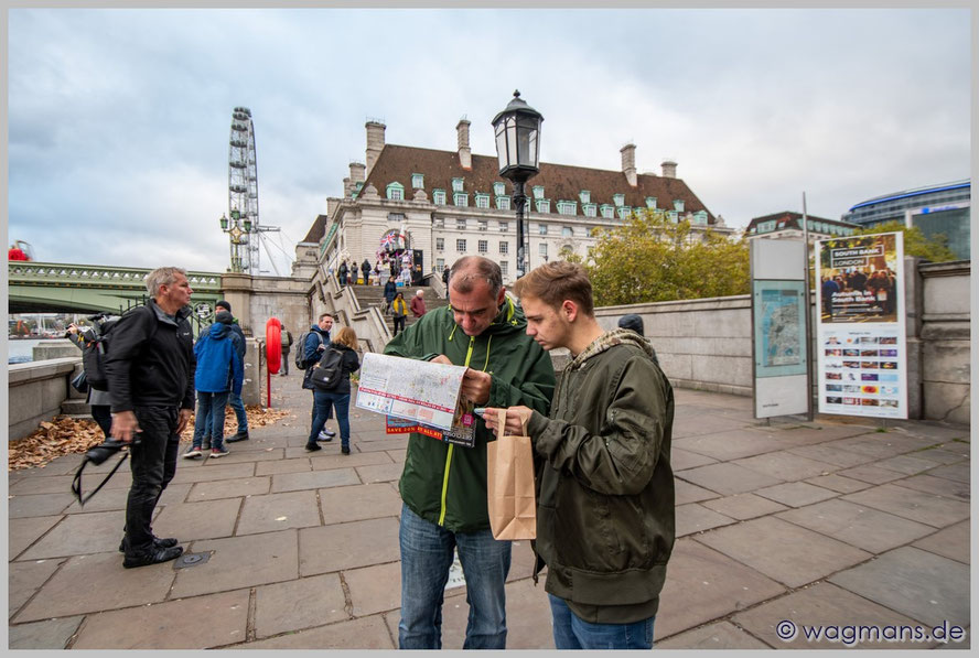 Wir liefen noch bis zur Westminster Bridge. Dort inspizierten wir unseren schlauen Plan, ob wir nicht gleich zu Fuß zum Hotel laufen könnten.