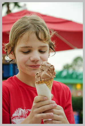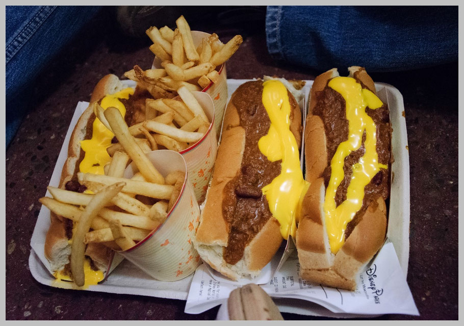Dann musste endlich unser Hunger gestillt werden. Weil in Paris ein Hot Dog bei Caseys Corner für uns immer sein muss, wollten wir ihn hier auch ausprobieren. Da es noch recht voll im Park war, war an einen freien Tisch nicht zu denken. Also machten wir es den jüngeren Amis nach und pflanzten uns auf den Boden. Hat doch auch mal was! :-D Die Hot Dogs mit Chilli und Cheese waren zwar eine richtige Sauerei zum essen.... aber soooo lecker.