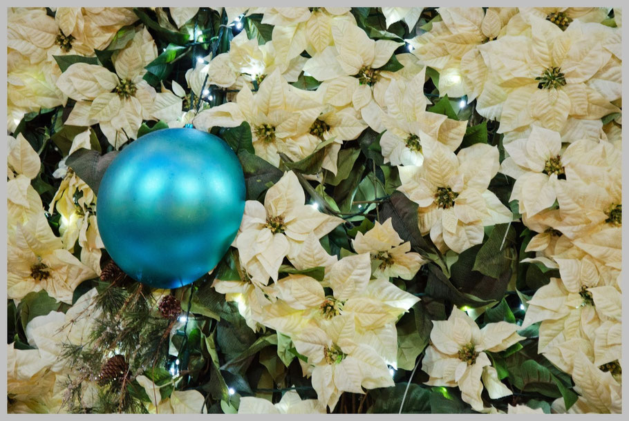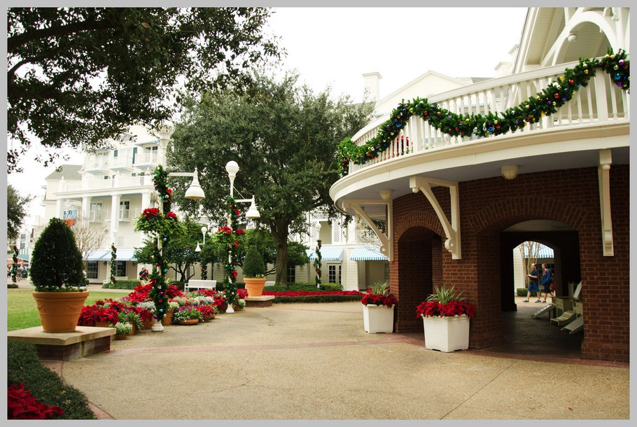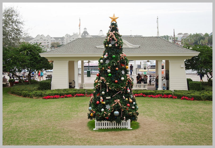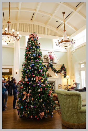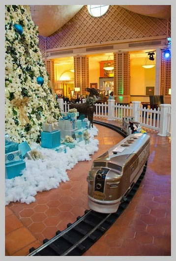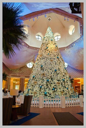 Wir verbrachten auf dem Minigolfplatz mehr Zeit als anfangs gedacht und so hieß es nach dem Spiel ganz schnell zum Dolphin Hotel zur Autovermietung zu spurten. Alamo hat dort seinen Schalter in der Lobby. Beim Betreten der Lobby blieb uns fast die Spucke weg! Wahnsinn, was für ein schöner Christbaum! Passend zum Hotel in weiß/ türkis gehalten. Soooo schön und edel! Und um den Baum fuhr eine Eisenbahn mit Mickey und Minnie auf einem der Waggons.