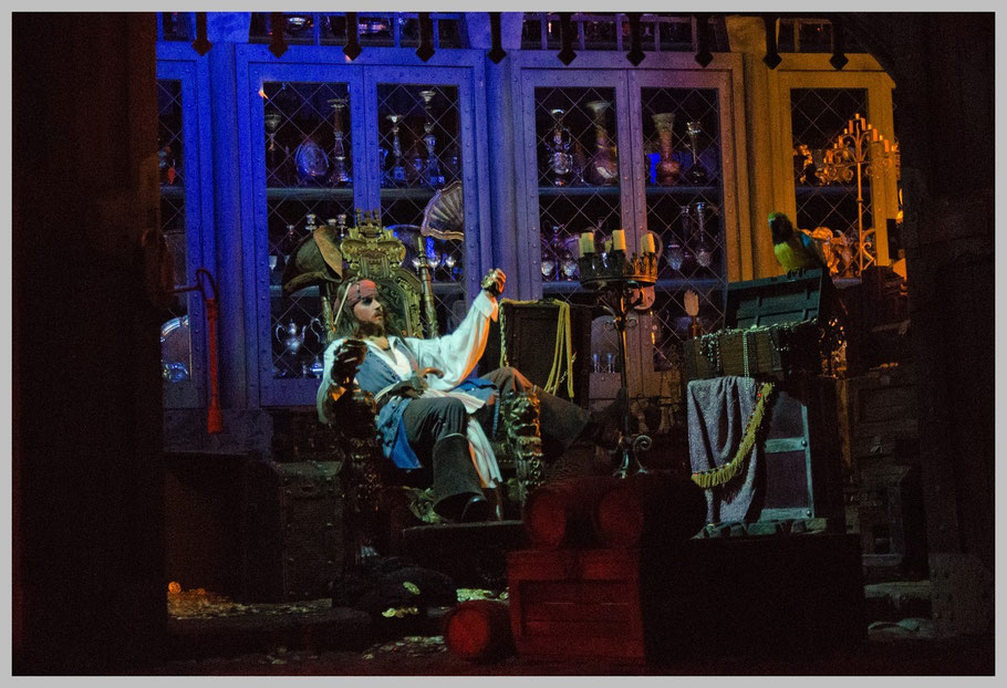 Die Piratenbahn punktete bei uns allein schon deshalb, weil hier Jack Sparrow anwesend war und Bäda war vom Eingangsbereich beeindruckt. Aber die reine Fahrt gefällt uns in Paris besser...