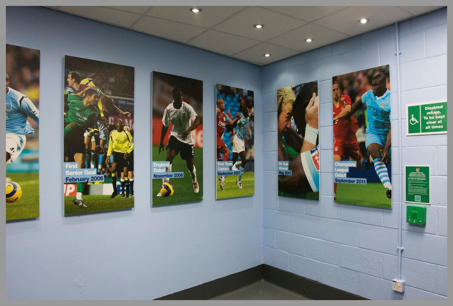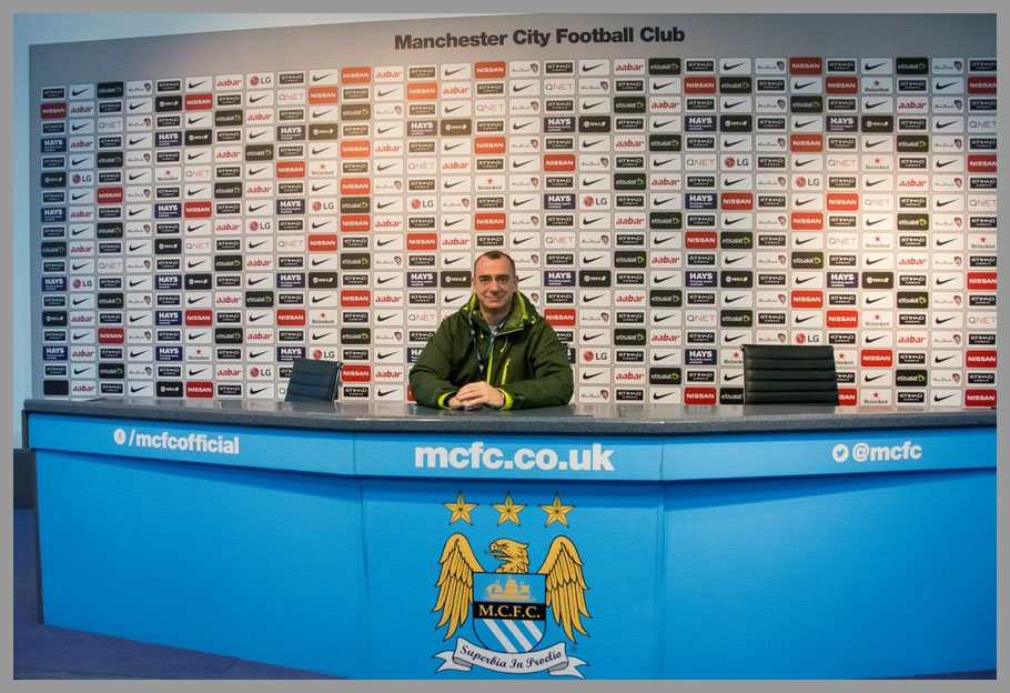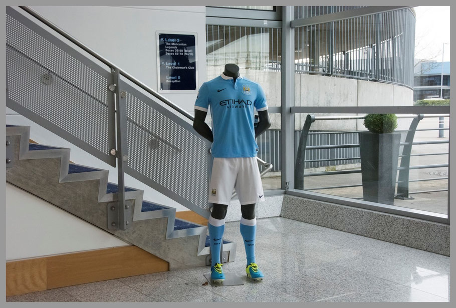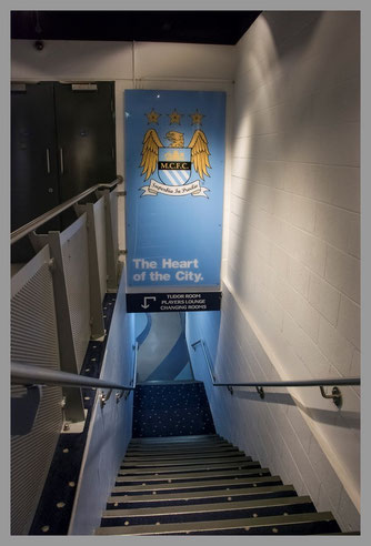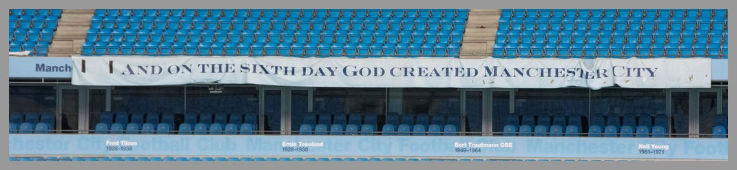 Die Besichtigung startete am „Colin Bell Stand“, benannt nach einer Vereinslegende. Die zweite Vereinslegende, die dort sogar ein Denkmal hat, ist - Achtung - ein Deutscher. Ja genau. Bernd Trautmann, ein Torhüter, der nach dem Krieg und nach Gefangenschaft in England blieb und dann dort zum Publikumsliebling wurde. Unsterblich wurde er, weil er den ersten FA-Cup Triumph von Manchester City ermöglichte, weil er bei knappem Spielstand ab der 70. Minute mit einem Genickbruch (!) zu Ende spielte. Es gab damals nämlich keine Wechselmöglichkeit für sein Team und die hätten zu zehnt ohne Keeper zu Ende spielen müssen. Und jetzt gibt’s ein Denkmal von ihm.