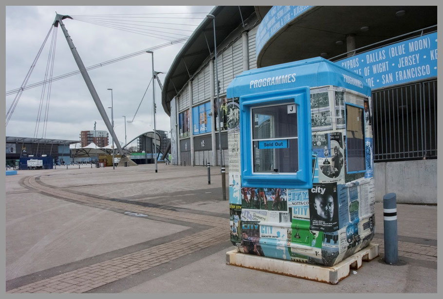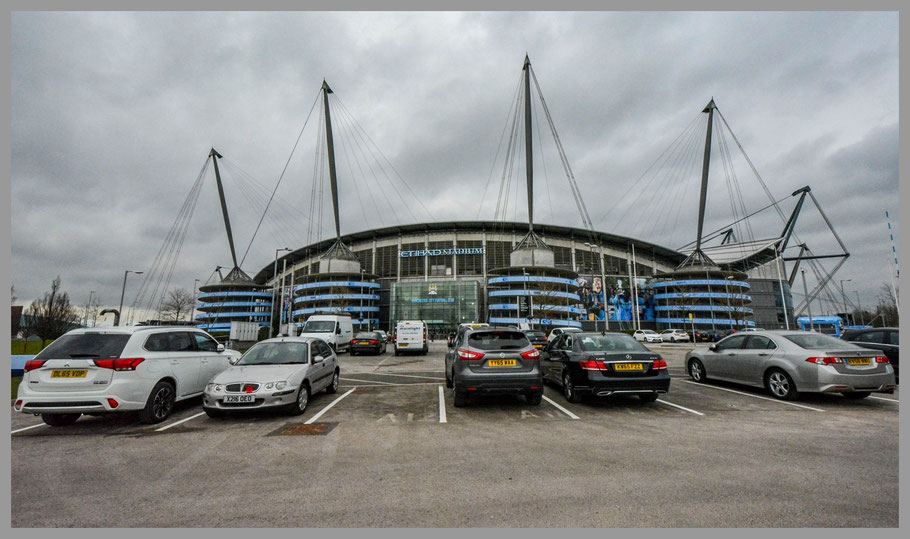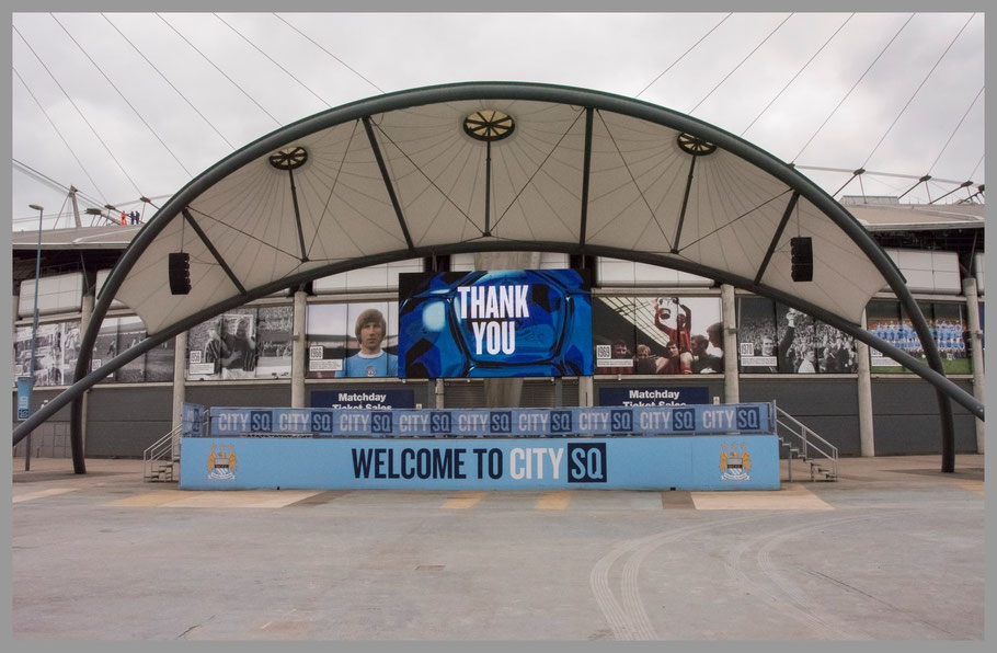 Die Unterschiede zwischen den beiden Stadien könnten größer nicht sein. Während Old Trafford ein Altbau mitten in der Stadt ist, liegt das Etihad-Stadium in einer Freifläche Richtung Stadtrand. Kein Wunder, das Stadion wurde als Leichtathletik-Stadion für die Commonwealth-Spiele gebaut und danach von Manchester City übernommen und zum Fußballstadion umgebaut. Deshalb ist auch die Umgebung komplett auf Sport gepolt, ein kleines Leichtathletik- und Fußballstadion gleich nebendran und verschiedenste Sporthallen.