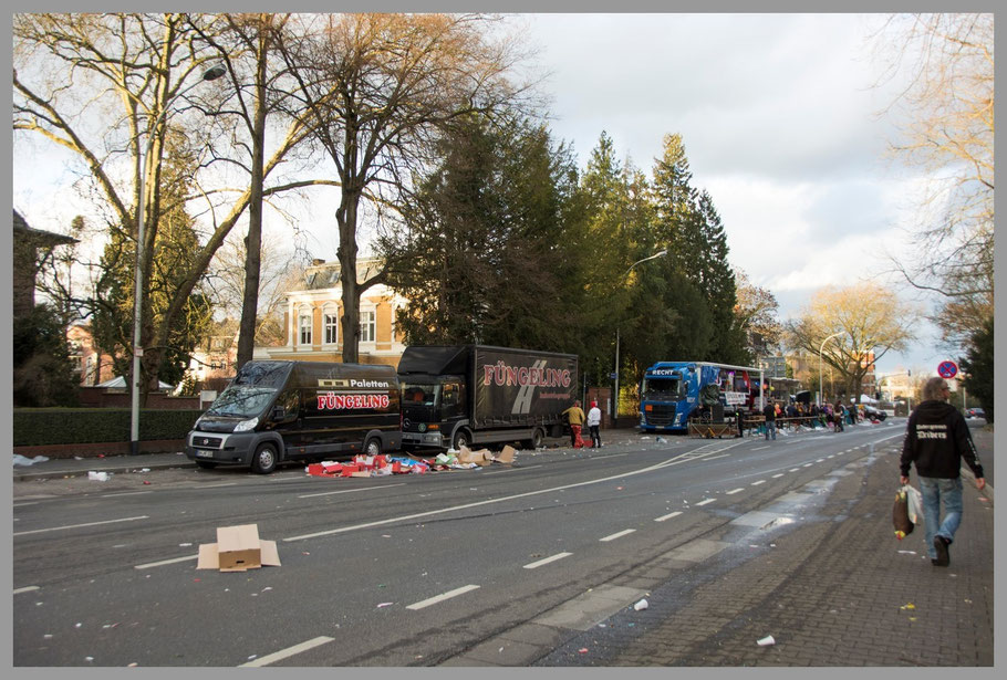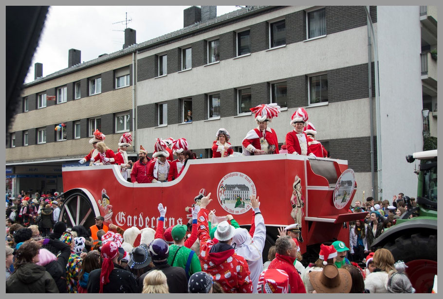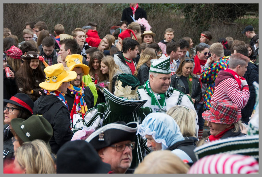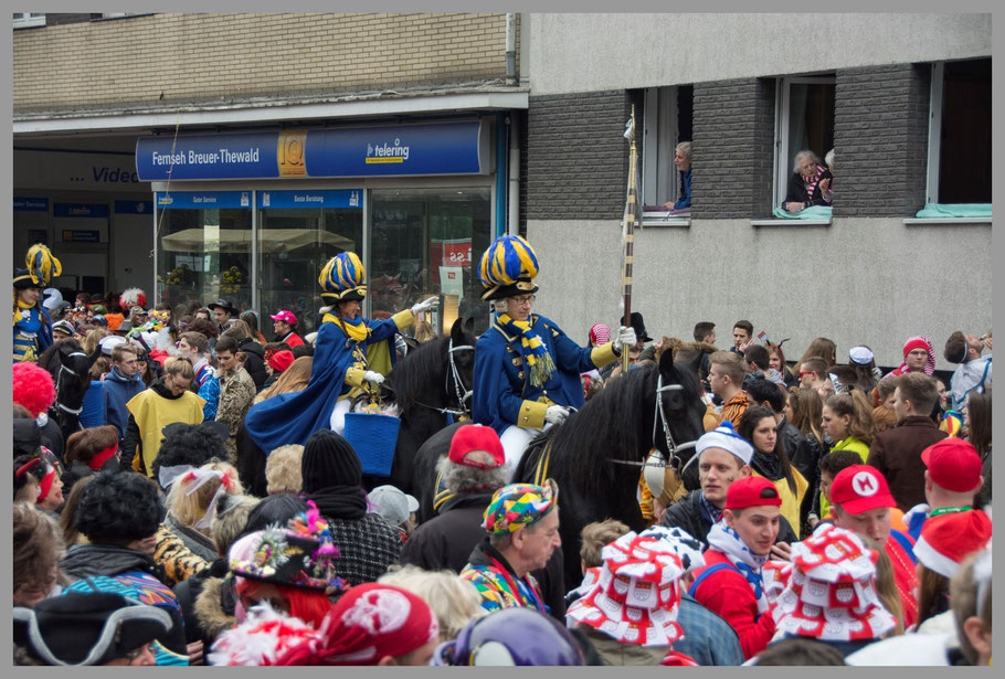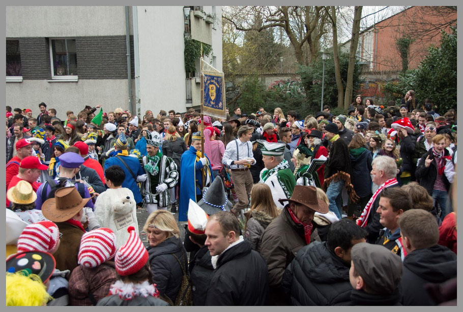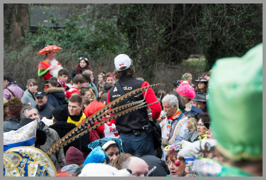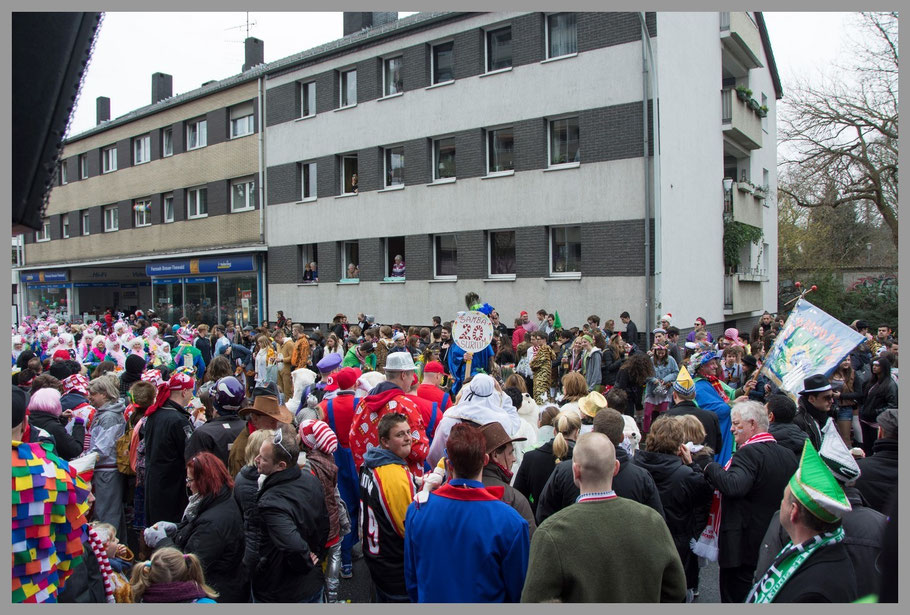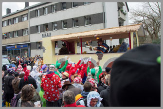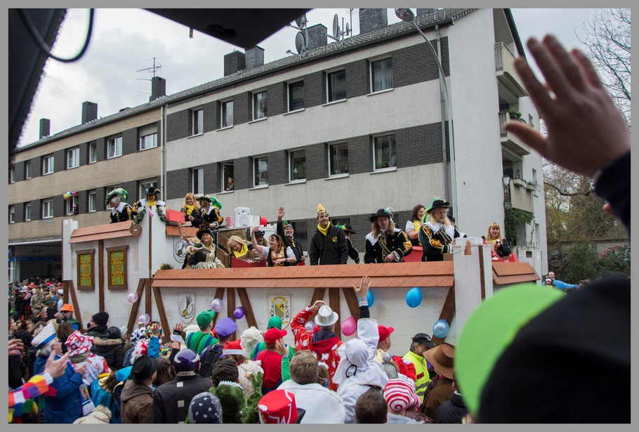 Die Kollegen aus dem Nachbarstadtteil Badorf um Prinz Tobi waren auch schon da, der Weg zum Partytruck in Brühl, von dem aus wir den Umzug anschauen sollten, wurde zusammen zurückgelegt. Also den Bauch vollgeschlagen und nix wie los. Die Kolonne war diesmal natürlich noch ein Stück länger als üblich. Cool! In Brühl angekommen, ging’s erstmal durch die Fußgängerzone Richtung Partytruck. Immer hinter unseren „Rockstars“ her. Anders konnte man die Jungs schon gar nicht mehr bezeichnen , so groß war streckenweise der Trubel.