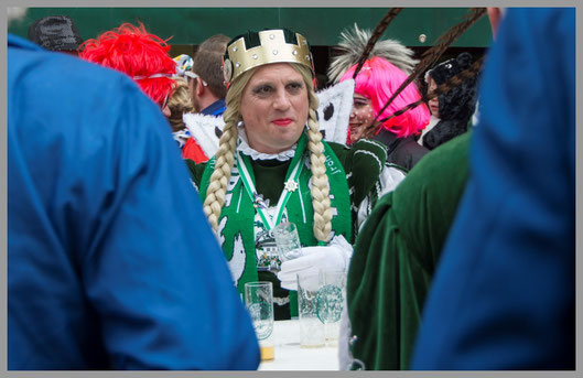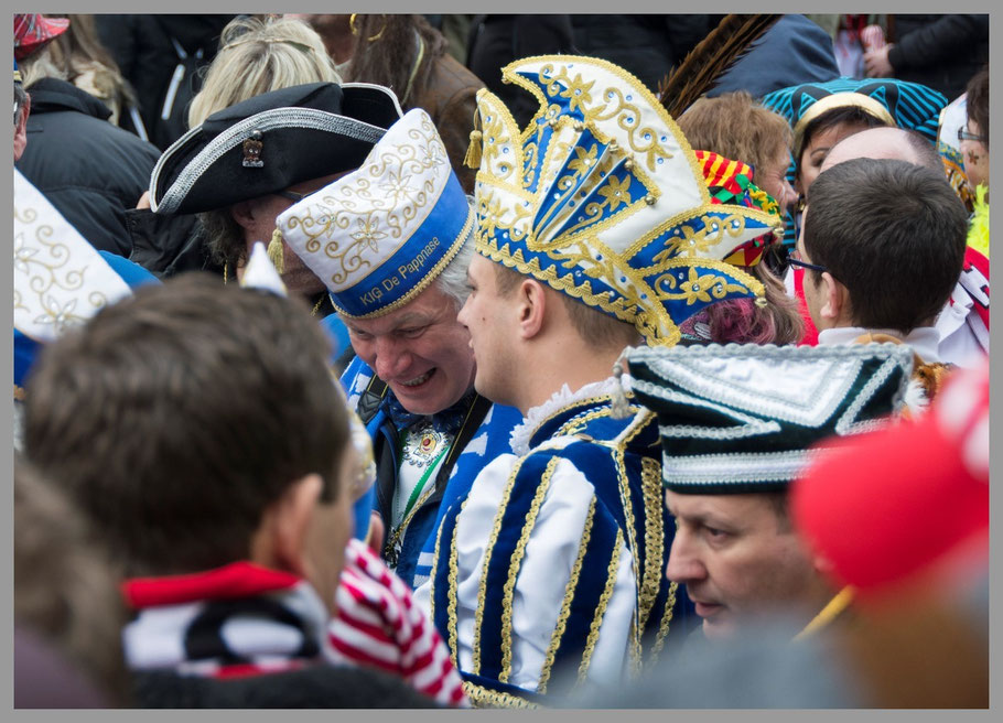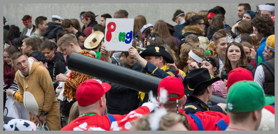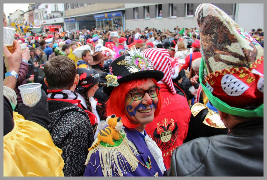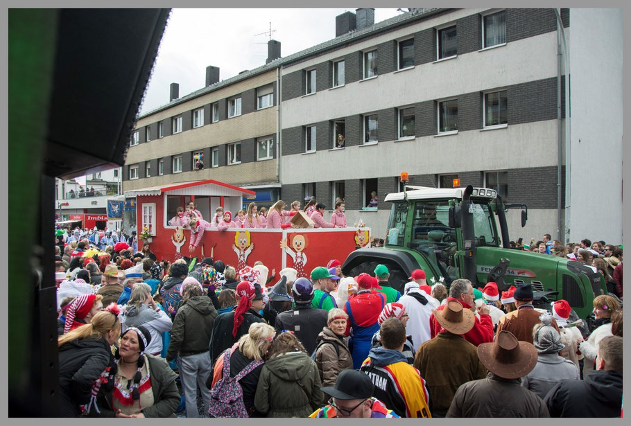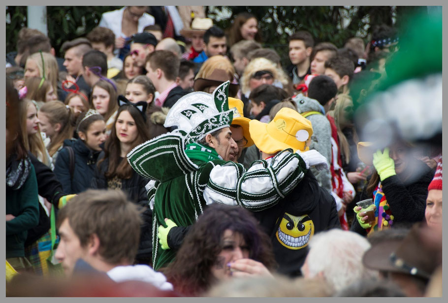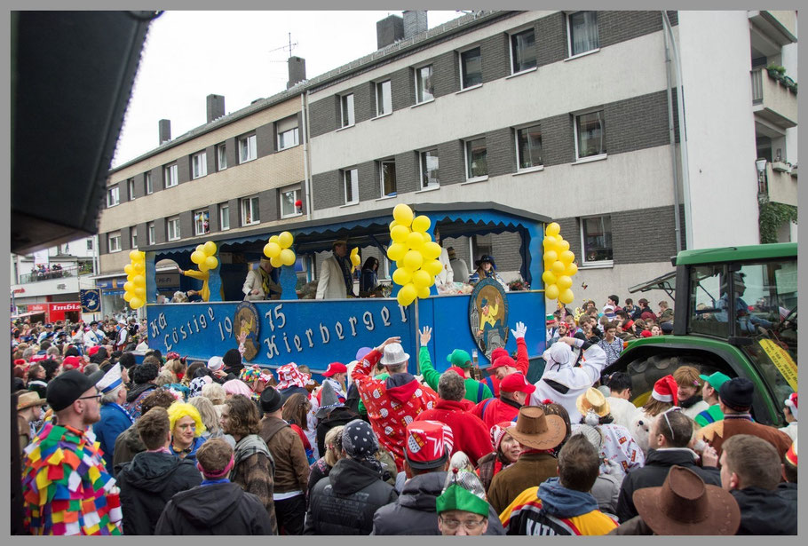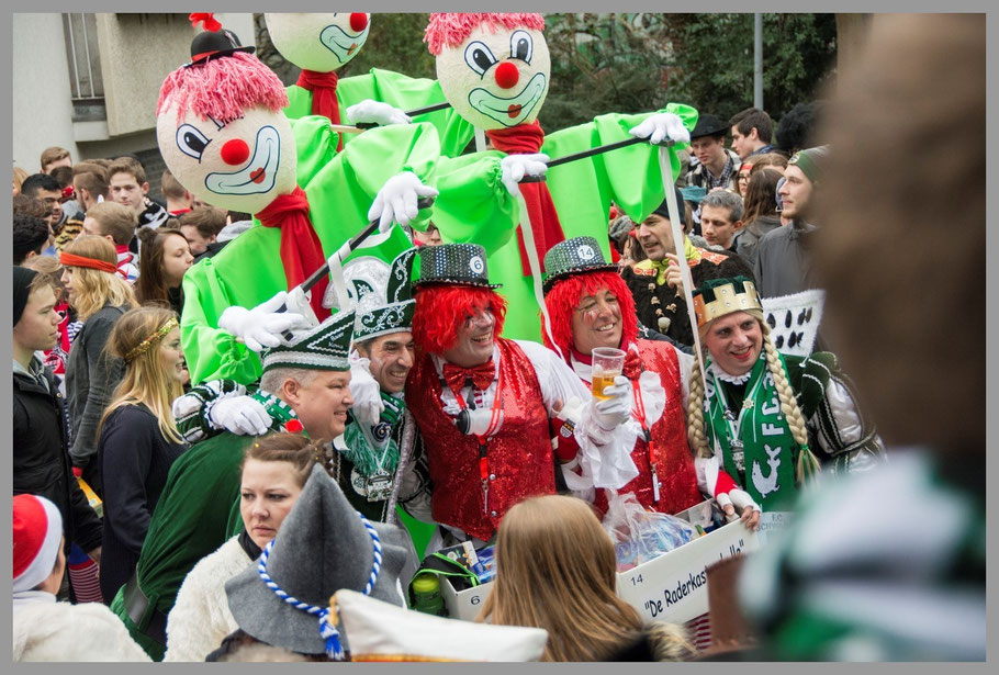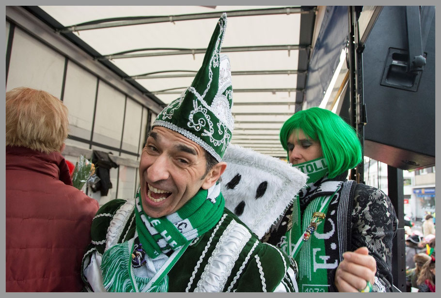 Die Kollegen aus dem Nachbarstadtteil Badorf um Prinz Tobi waren auch schon da, der Weg zum Partytruck in Brühl, von dem aus wir den Umzug anschauen sollten, wurde zusammen zurückgelegt. Also den Bauch vollgeschlagen und nix wie los. Die Kolonne war diesmal natürlich noch ein Stück länger als üblich. Cool! In Brühl angekommen, ging’s erstmal durch die Fußgängerzone Richtung Partytruck. Immer hinter unseren „Rockstars“ her. Anders konnte man die Jungs schon gar nicht mehr bezeichnen , so groß war streckenweise der Trubel.