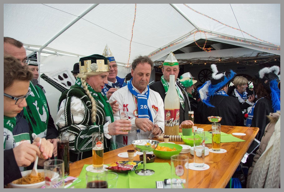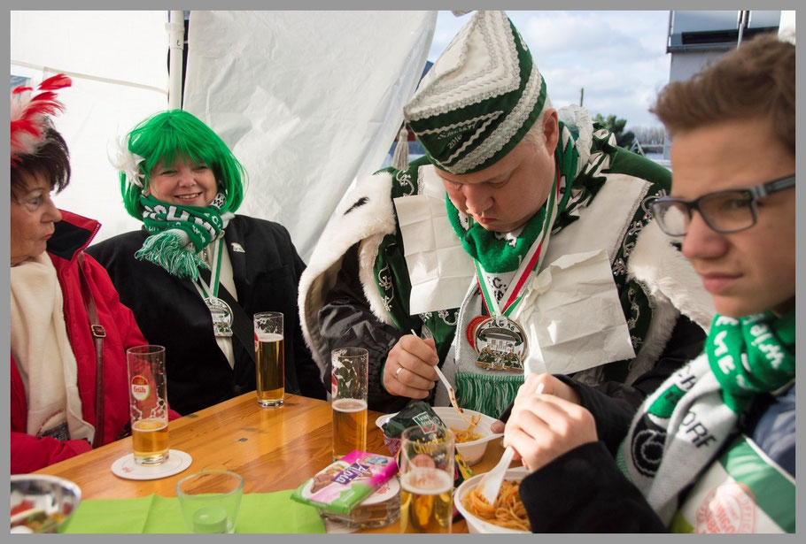 Im Anschluß gab’s was zu essen und –sowas- ein paar Kölsch. Mischa war wieder in seine Lieblingsposition als Getränkemanager zurückgekehrt. Und auch Prinz Udo trank wieder Bier. O-Ton: „Noch zwei, dann bin ich wieder am Start, das geht ruckzuck.“